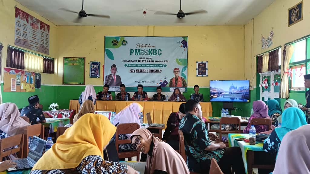Sumenep, 5 Oktober 2025 — Seluruh guru MTs Negeri 1 Sumenep mengikuti Pelatihan Pembelajaran Mendalam (PM) dalam Bingkai Kurikulum Berbasis Cinta (KBC) yang dilaksanakan di aula MTs Negeri 1 Sumenep pada hari Minggu, 5 Oktober 2025, mulai pukul 09.00 hingga 16.00 WIB. Kegiatan ini diikuti oleh 66 orang guru dari berbagai mata pelajaran.