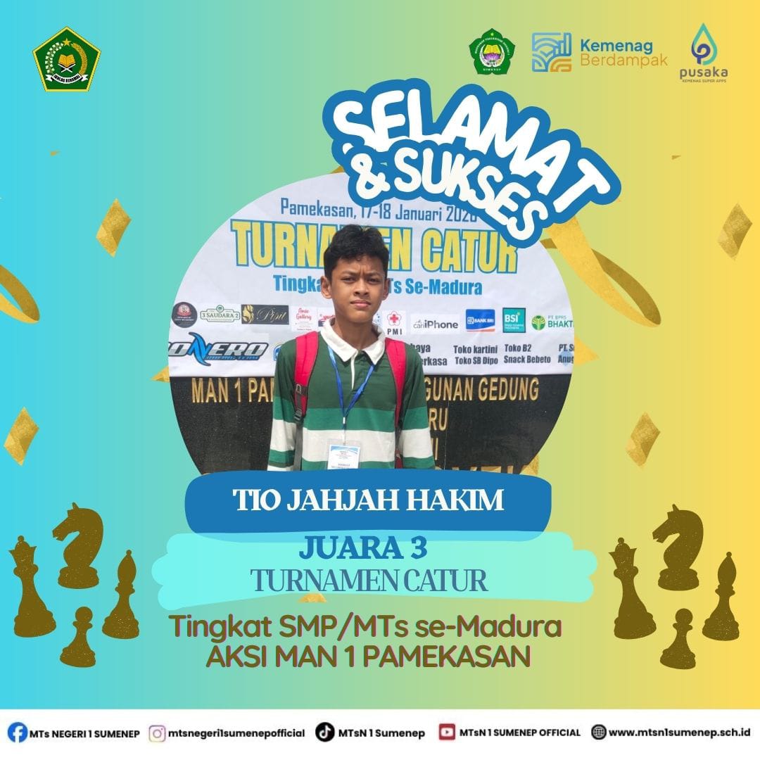 Dengan keterampilan serta semangat yang tinggi, Tio Jahjah Hakim (kelas VII-A) berhasil mengalahkan lawan-lawannya, yaitu meraih juara 3 lomba catur se-Madura. Sementara itu, Ismed Kivlan Zain (kelas VIII-B) berhasil meraih juara 2 lomba tahfiz putra juz 1-3 se-Madura. Prestasi yang diraih tidak hanya membanggakan orang tua dan MTsN 1 Sumenep, tetapi juga akan menjadi motivasi dan inspirasi bagi siswa-siswi yang ada di MTsN 1 Sumenep untuk lebih berprestasi. Khususnya dalam ajang yang sama yaitu AKSI (Ajang Kompetisi Siswa Berprestasi) se-Madura.